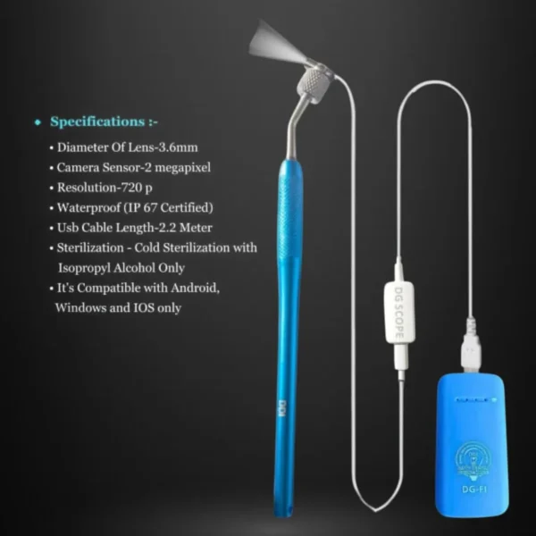 DDI DG Scope Wireless Digital Loupe is an advanced tool designed to enhance precision in diagnostic, procedural, and documentation tasks. Featuring a compact lens and a high-quality camera sensor, it captures clear, high-definition images and videos, providing detailed visualization essential for clinical accuracy. The device is waterproof and dust-resistant, making it durable and suitable for various medical environments. It connects easily via a long USB cable, offering flexibility and convenience during use. Sterilization is performed using cold sterilization methods with isopropyl alcohol, ensuring hygiene without damaging sensitive components. The ergonomic handle allows comfortable maneuvering, while the included user manual guides efficient setup and operation. This device combines functionality and durability, making it a valuable asset for healthcare professionals seeking reliable magnification and imaging solutions.