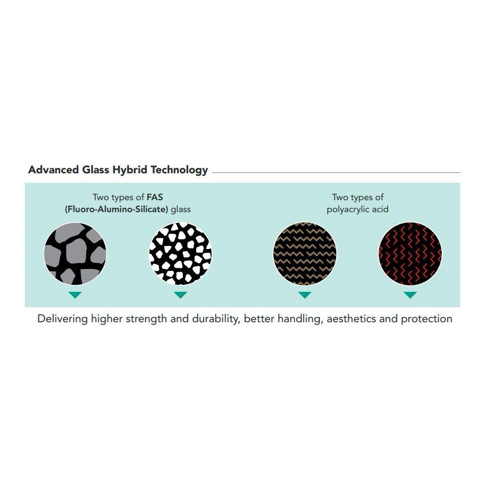 Advanced Glass hybrid technology is the combination of two types of Fluoro-Almino-Silicate(FAS) glass and also two types of polyacrylic acid.