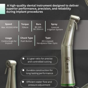 The external irrigation spray system ensures efficient cooling during drilling, while its compact, ergonomic design offers comfortable handling and reduced fatigue during long surgical procedures. Built for durability and long-lasting clinical performance, it is an ideal choice for modern implant practices.