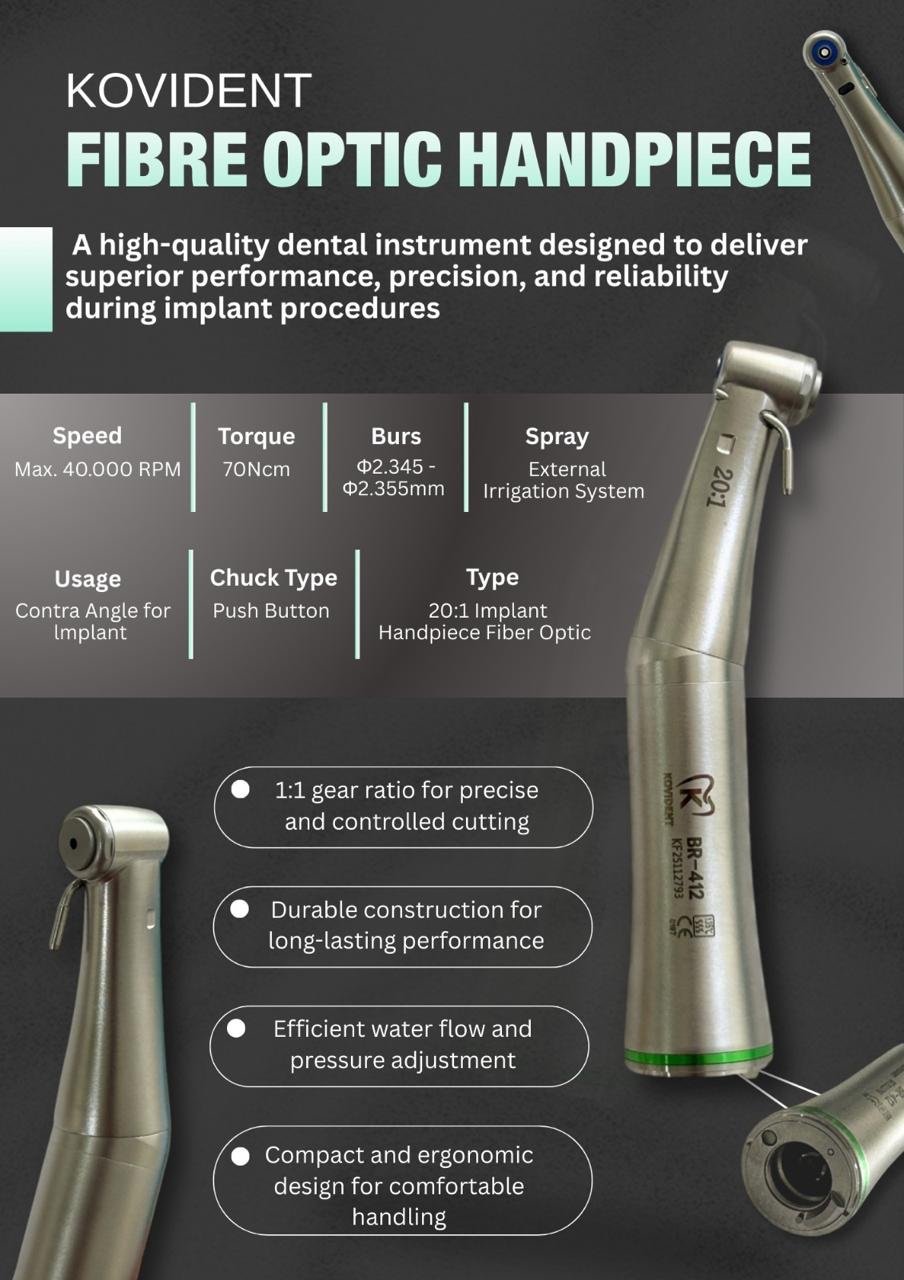 The Kovident 20:1 Fiber Optic Implant Handpiece is a premium surgical contra-angle designed to deliver superior precision, visibility, and torque control during implant procedures. Integrated fiber optic illumination ensures enhanced intraoral visibility, improving surgical accuracy and efficiency.
