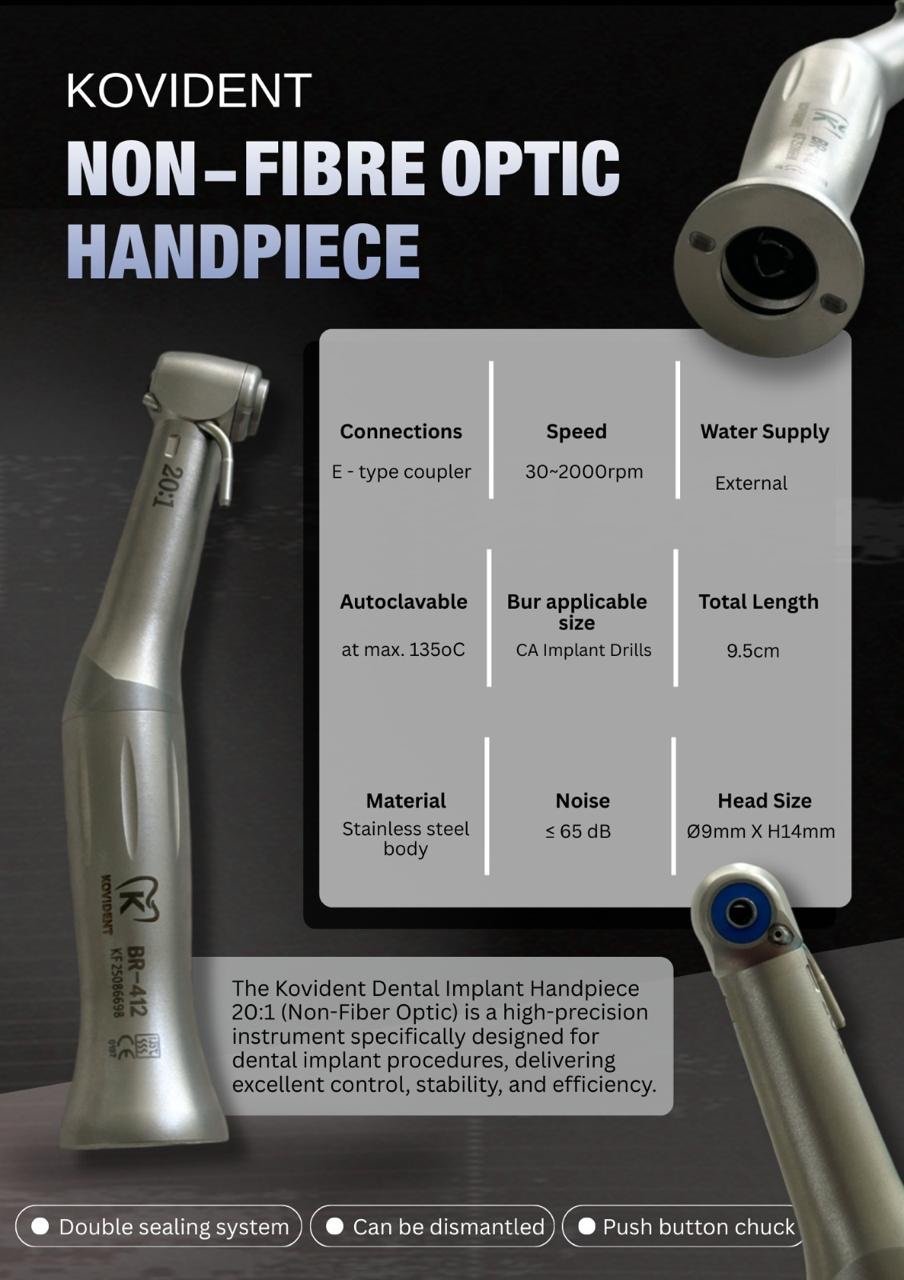 The Kovident 20:1 Non-Fiber Optic Implant Handpiece is a high-precision contra-angle designed specifically for dental implant procedures. Built with a durable stainless steel body, this handpiece ensures excellent control, stability, and long-term performance during surgical implant placement.